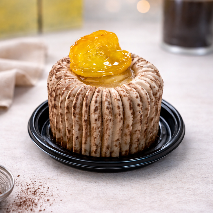 Mousse chocolat lait, bavaroise noisette, caramel noisette abricots rotis et gelée d’abricot biscuit amande.